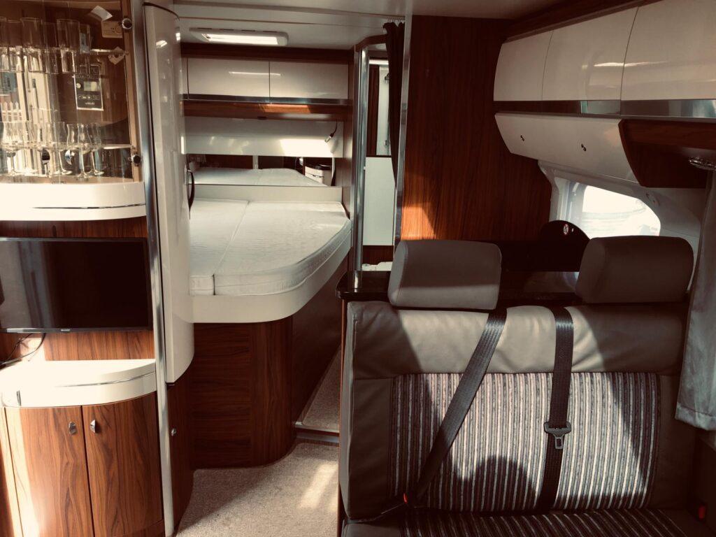As you step into the motorhome, to the right is the lounge / dining area With front facing sofa with 2 travelling belts a large side sofa. The two captains seats swivel and the dining table has an adjustable extension to make dining extremely comfortable for 6. There is TV sideboard with attractive glass display case above and LED lighting. The Satellite equipment located in the cupboard below the TV.